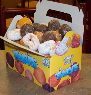 ドーナッツは有名なチェーン店、ティムホートンズ:TimHortons のTimBitsというものだった。
